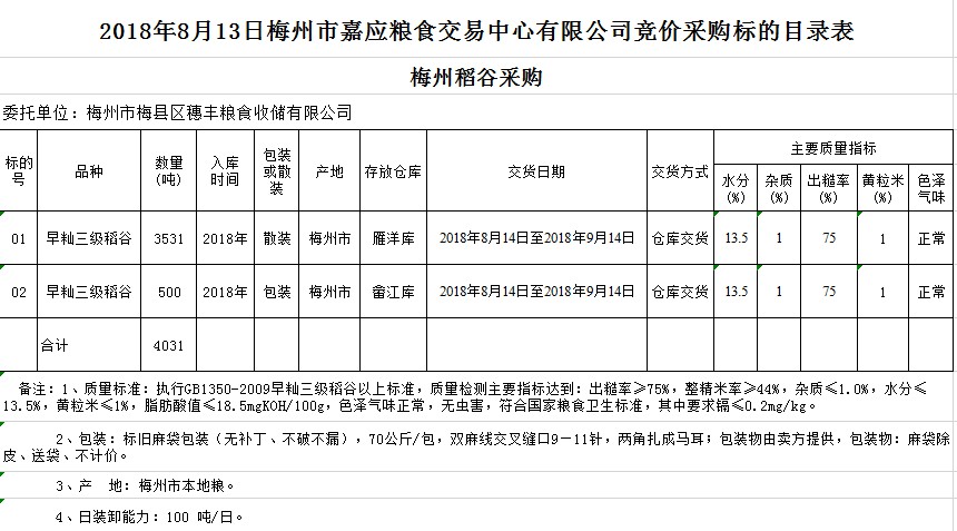 受客戶委托,梅州市嘉應(yīng)糧食交易中心有限公司定于2018年8月13日(星期一)舉辦糧食競價交易會,梅州市梅縣區(qū)穗豐糧食收儲有限公司擬采購2018年早秈稻4031噸。