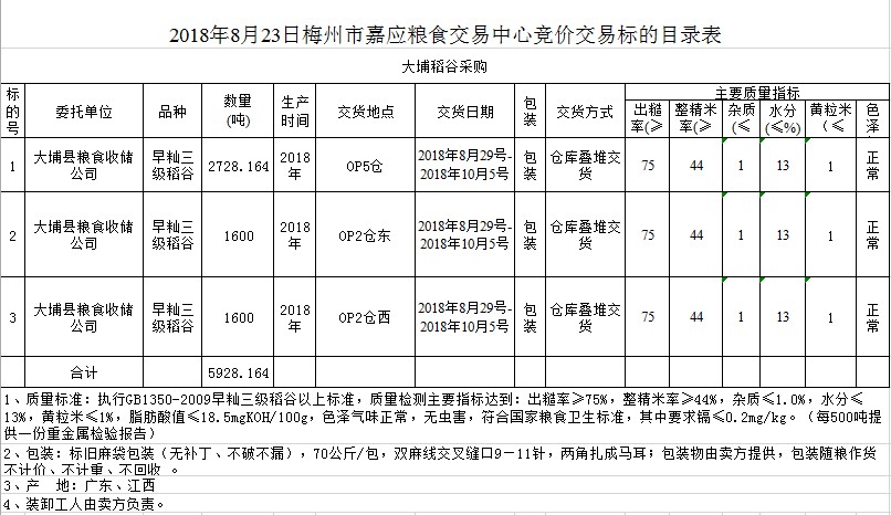 交易時間和地點:2018年8月23日(星期四)上午10時。廣東省梅州市彬芳大道南161號梅州市糧食交易中心3樓。