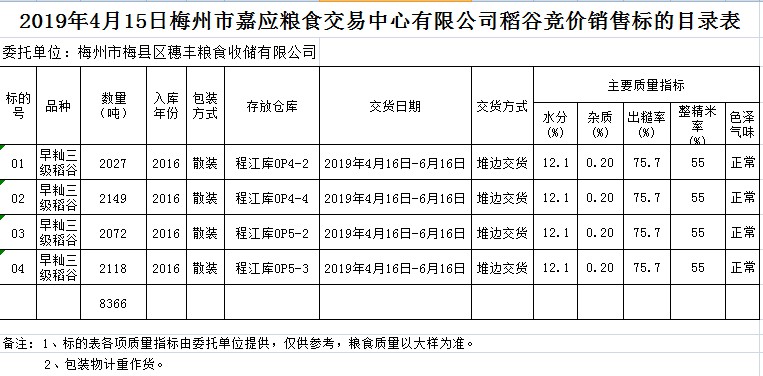 受客戶委托,梅州市嘉應(yīng)糧食交易中心有限公司定于2019年4月15日(星期一)舉辦糧食競價交易會,梅州市梅縣區(qū)穗豐糧食收儲有限公司擬銷售2016年早秈稻8366噸。
