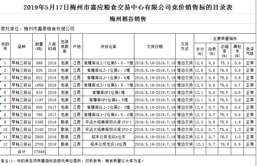 受客戶(hù)委托,梅州市嘉應(yīng)糧食交易中心有限公司定于2019年5月17日(星期五)舉辦糧食競(jìng)價(jià)交易會(huì),梅州市嘉泰糧食收儲(chǔ)公司擬銷(xiāo)售2016年、2017年早秈稻17646噸。