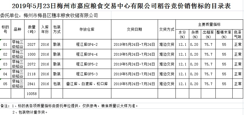 受客戶委托,梅州市嘉應(yīng)糧食交易中心有限公司定于2019年5月23日(星期四)舉辦糧食競價交易會,梅州市梅縣區(qū)穗豐糧食收儲有限公司擬銷售2016年早秈稻10058噸。