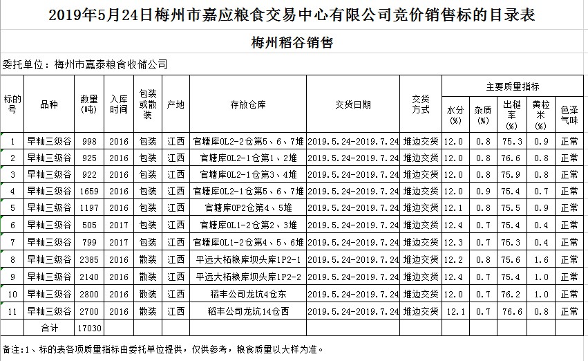 受客戶委托,梅州市嘉應(yīng)糧食交易中心有限公司定于2019年5月24日(星期五)舉辦糧食競(jìng)價(jià)交易會(huì),梅州市嘉泰糧食收儲(chǔ)公司擬銷售2016年、2017年早秈稻17030噸。