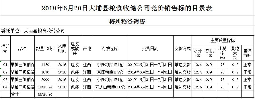 受客戶委托,梅州市嘉應糧食交易中心有限公司定于2019年6月20日(星期四)舉辦糧食競價交易會,大埔縣糧食收儲公司擬銷售2016年早秈稻6639.24噸。