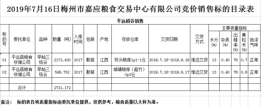 受客戶委托,梅州市嘉應(yīng)糧食交易中心有限公司定于2019年7月16日(星期二)舉辦糧食競(jìng)價(jià)交易會(huì),平遠(yuǎn)縣糧食收儲(chǔ)公司擬銷售2017年早秈稻2721.172噸。