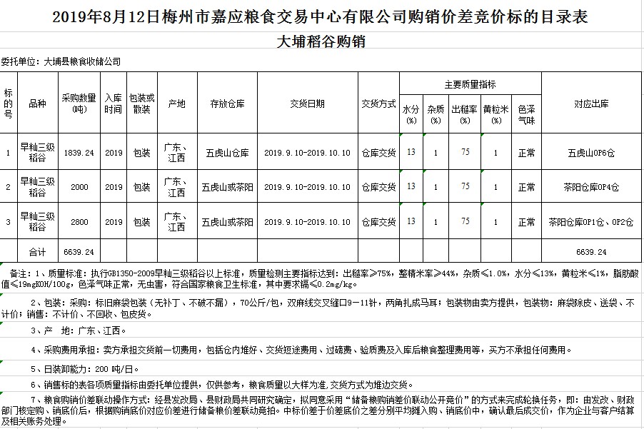 受客戶委托,梅州市嘉應(yīng)糧食交易中心有限公司定于2019年8月12日(星期一)舉辦稻谷購銷價(jià)差聯(lián)動(dòng)標(biāo)的交易會(huì),大埔縣糧食收儲(chǔ)公司擬銷售和采購早秈稻6639.24噸。