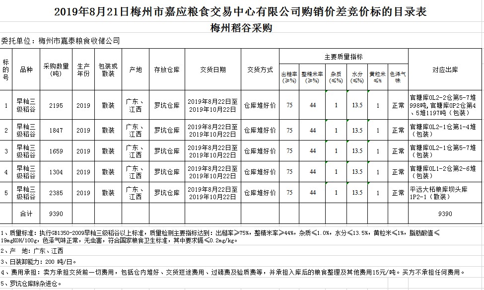 受客戶委托,梅州市嘉應(yīng)糧食交易中心有限公司定于2019年8月21日(星期三)舉辦稻谷購銷價差聯(lián)動標(biāo)的交易會,梅州市嘉泰糧食收儲公司擬銷售和采購早秈稻9390噸。