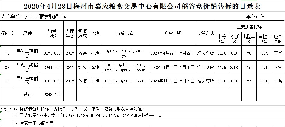 受客戶委托,梅州市嘉應(yīng)糧食交易中心有限公司定于2020年4月28日(星期二)舉辦糧食競價(jià)交易會(huì),興寧市糧食收儲(chǔ)公司擬銷售2017年早秈稻9248.406噸。