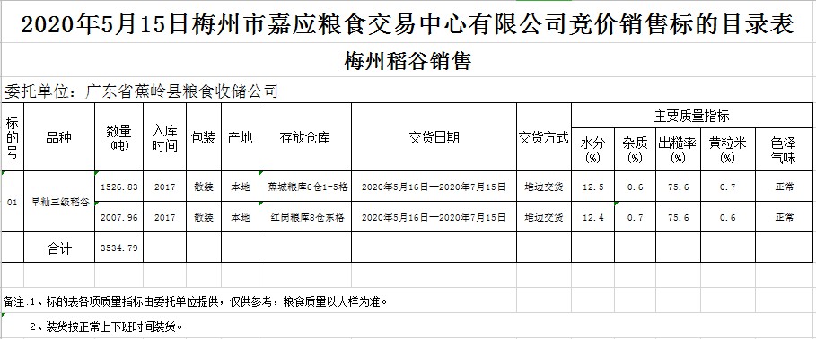 受客戶委托,梅州市嘉應(yīng)糧食交易中心有限公司定于2020年5月15日(星期五)舉辦糧食競價(jià)交易會(huì),廣東省蕉嶺縣糧食收儲(chǔ)公司擬銷售2017年早秈稻3534.79噸。