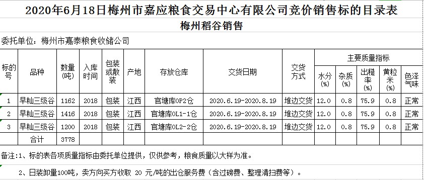 受客戶委托,梅州市嘉應(yīng)糧食交易中心有限公司定于2020年6月18日(星期四)舉辦糧食競價(jià)交易會(huì),梅州市嘉泰糧食收儲(chǔ)公司擬銷售2018年早秈稻3778噸。