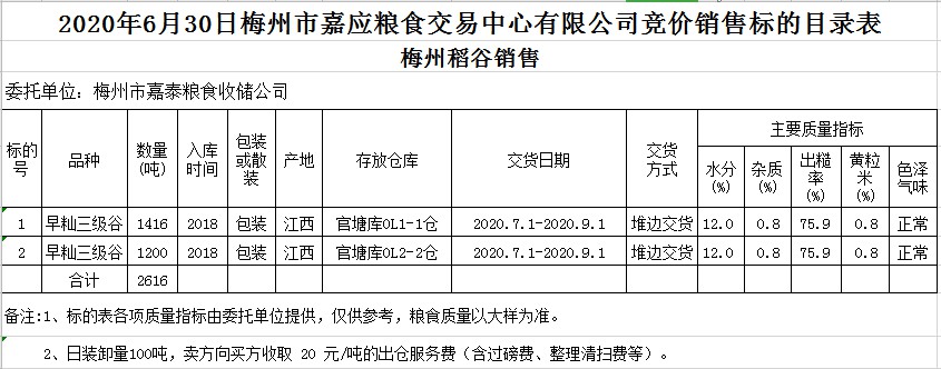 受客戶委托,梅州市嘉應(yīng)糧食交易中心有限公司定于2020年6月30日(星期二)舉辦糧食競價(jià)交易會(huì),梅州市嘉泰糧食收儲(chǔ)公司擬銷售2018年早秈稻2616噸。