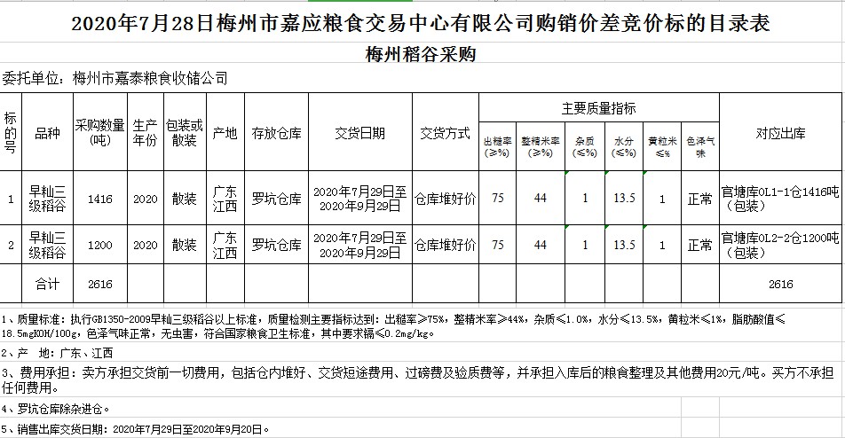受客戶委托,梅州市嘉應(yīng)糧食交易中心有限公司定于2020年7月28日(星期二)舉辦稻谷購銷價(jià)差聯(lián)動(dòng)標(biāo)的交易會,梅州市嘉泰糧食收儲公司擬銷售和采購早秈稻2616噸。