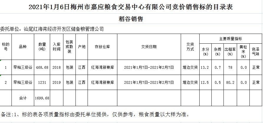 受客戶委托,梅州市嘉應(yīng)糧食交易中心有限公司定于2021年1月6日(星期三)舉辦糧食競(jìng)價(jià)交易會(huì),汕尾紅海灣經(jīng)濟(jì)開發(fā)區(qū)儲(chǔ)備糧管理公司擬銷售2018年早秈三級(jí)稻谷468.68噸;2019年早秈三級(jí)稻谷1231噸。