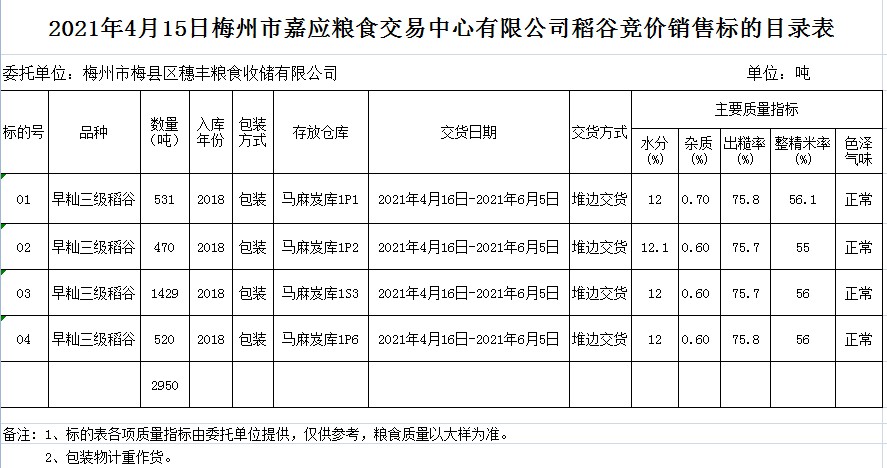 受客戶委托,梅州市嘉應(yīng)糧食交易中心有限公司定于2021年4月15日(星期四)舉辦糧食競價交易會。梅州市梅縣區(qū)穗豐糧食收儲有限公司擬銷售2018年早秈稻2950噸。
