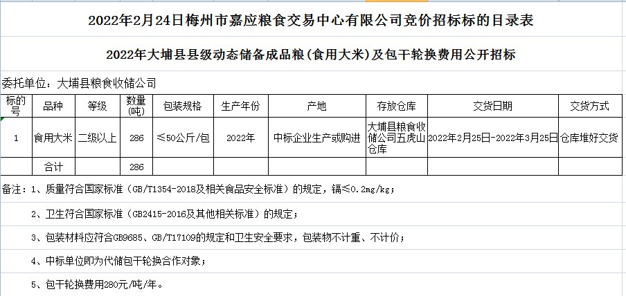 2022年大埔縣縣級動態(tài)儲備成品糧(食用大米)及包干輪換費用公開招標公告
