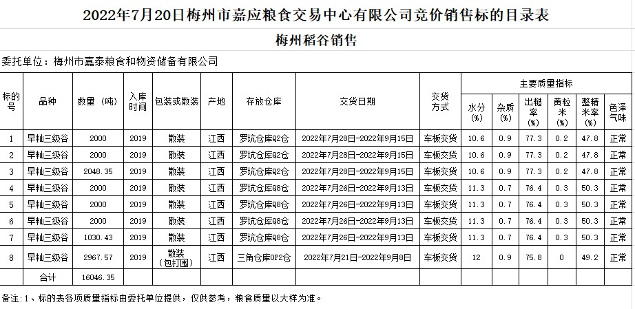受客戶委托,梅州市嘉應(yīng)糧食交易中心有限公司定于2022年7月20日(星期三)舉辦糧食競價交易會。梅州市嘉泰糧食和物資儲備有限公司擬銷售2019年早秈稻16046.35噸。
