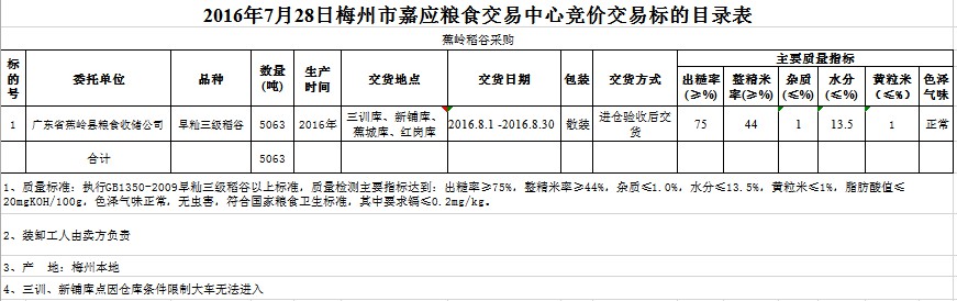 受客戶委托,梅州市嘉應糧食交易中心有限公司定于2016年7月28日舉辦糧食競價交易會,廣東省蕉嶺縣糧食收儲公司擬采購2016年產早秈三級稻谷5063噸。