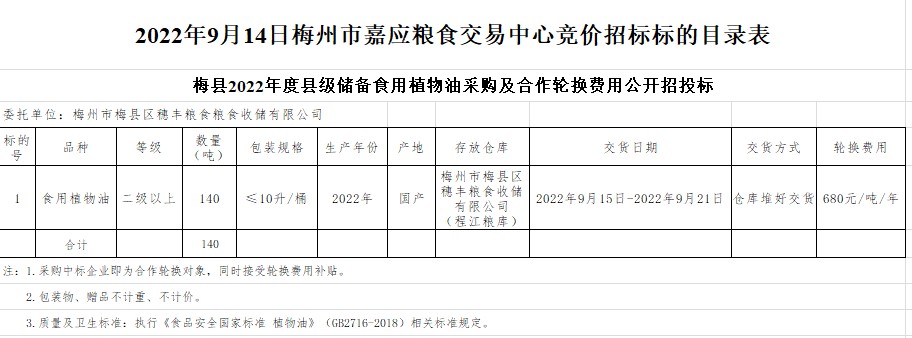 2022年9月14日梅州市梅縣區(qū)穗豐糧食收儲(chǔ)有限公司食用植物油采購(gòu)及合作輪換費(fèi)公開(kāi)競(jìng)價(jià)招標(biāo)公告
