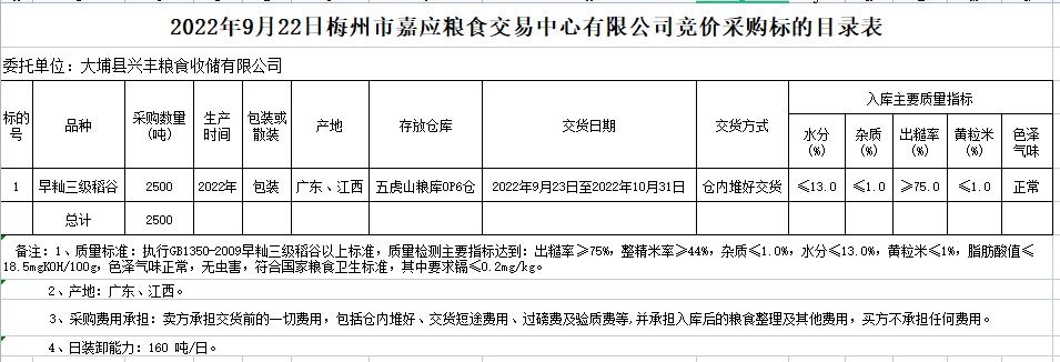 受客戶委托,梅州市嘉應(yīng)糧食交易中心有限公司定于2022年9月22日(星期四)舉辦糧食競(jìng)價(jià)交易會(huì)。大埔縣興豐糧食收儲(chǔ)有限公司擬采購(gòu)2022年早秈稻2500噸。