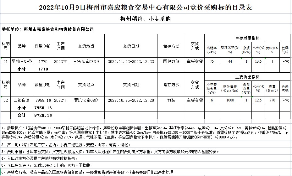 受客戶(hù)委托,梅州市嘉應(yīng)糧食交易中心有限公司定于2022年10月9日(星期日)舉辦糧食競(jìng)價(jià)交易會(huì)。梅州市嘉泰糧食和物資儲(chǔ)備有限公司擬采購(gòu)2022年早秈稻1770噸、二級(jí)白麥7958.16噸。