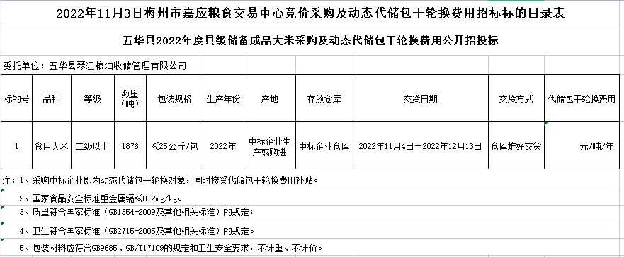 受客戶委托,梅州市嘉應糧食交易中心有限公司定于2022年11月3日(星期四)上午10時在廣東省梅州市彬芳大道南161號梅州市糧食交易中心3樓,舉辦五華縣縣級成品糧采購及動態(tài)代儲包干輪換費用公開招標。