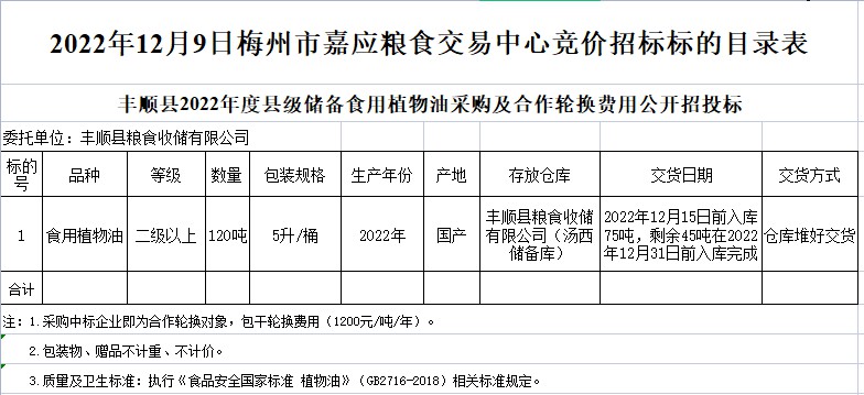 豐順縣2022年度縣級(jí)儲(chǔ)備食用植物油采購及合作輪換費(fèi)用公開招投標(biāo)公告