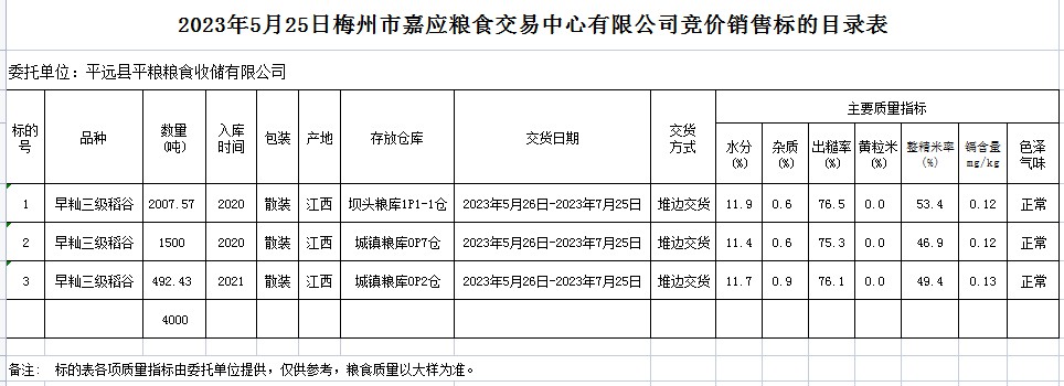 受客戶(hù)委托,梅州市嘉應(yīng)糧食交易中心有限公司定于2023年5月25日(星期四)舉辦糧食競(jìng)價(jià)交易會(huì)。平遠(yuǎn)縣平糧糧食收儲(chǔ)有限公司擬銷(xiāo)售2020年、2021年早秈稻4000噸。