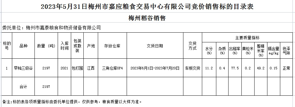 受客戶委托,梅州市嘉應(yīng)糧食交易中心有限公司定于2023年5月31日(星期三)舉辦糧食競(jìng)價(jià)交易會(huì)。梅州市嘉泰糧食和物資儲(chǔ)備有限公司擬銷售2021年早秈稻2197噸。