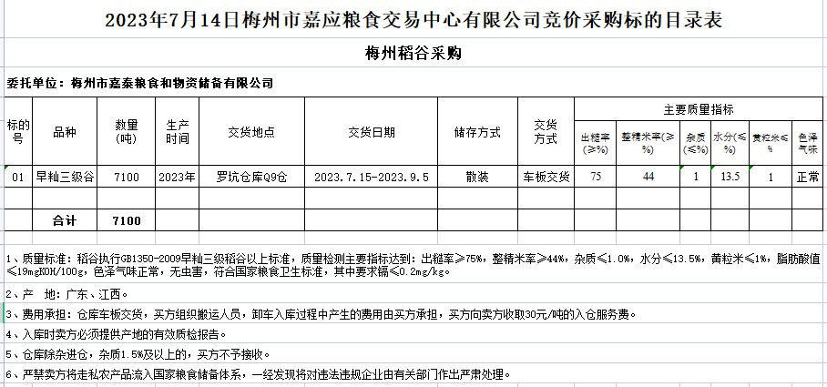 受客戶委托,梅州市嘉應(yīng)糧食交易中心有限公司定于2023年7月14日(星期五)舉辦糧食競價(jià)交易會(huì)。梅州市嘉泰糧食和物資儲(chǔ)備有限公司擬采購2023年早秈稻7100噸。