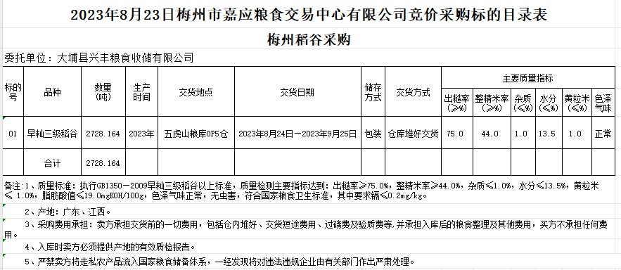受客戶委托,梅州市嘉應(yīng)糧食交易中心有限公司定于2023年8月23日(星期三)舉辦糧食競價(jià)交易會(huì)。大埔縣興豐糧食收儲有限公司擬采購2023年早秈稻2728.164噸。