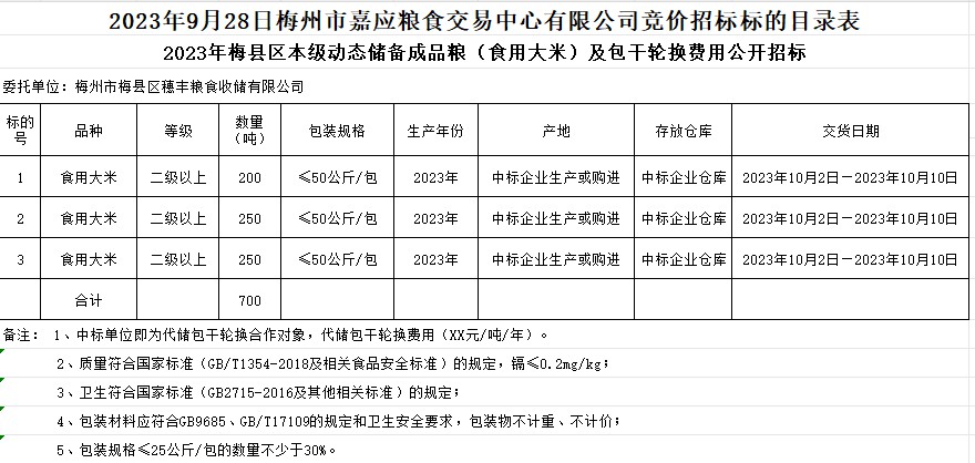 梅縣區(qū)2023年本級動態(tài)儲備成品糧采購及包干輪換費(fèi)用公開招投標(biāo)公告