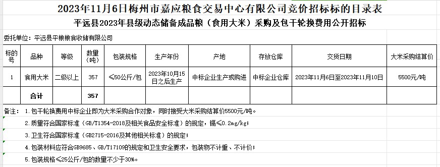 受客戶委托,梅州市嘉應(yīng)糧食交易中心有限公司定于2023年11月6日(星期一)上午10時在廣東省梅州市彬芳大道南161號梅州市糧食交易中心3樓,舉辦平遠縣2023年縣級動態(tài)儲備成品糧(食用大米)采購及包干輪換費用公開招標(biāo)。