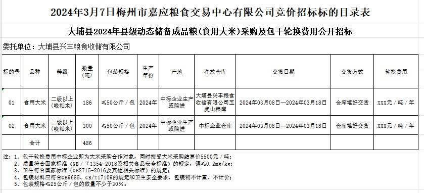 大埔縣2024年縣級動(dòng)態(tài)儲(chǔ)備成品糧(食用大米)采購及包干輪換費(fèi)用公開招標(biāo)公告
