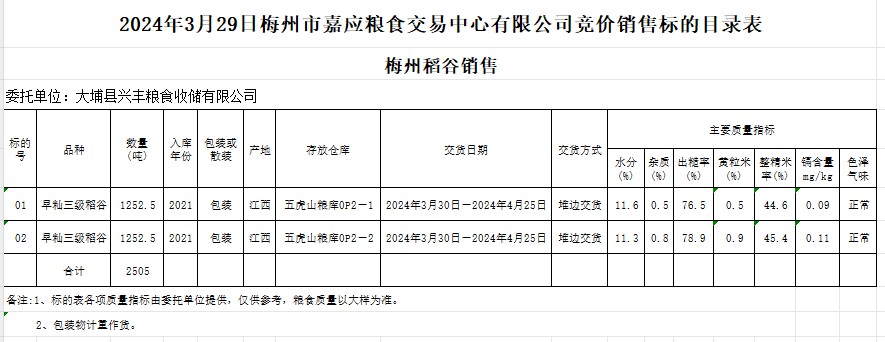 受客戶委托,梅州市嘉應(yīng)糧食交易中心有限公司定于2024年3月29日(星期五)舉辦糧食競價交易會。大埔縣興豐糧食收儲有限公司擬銷售2021年早秈稻2505噸。