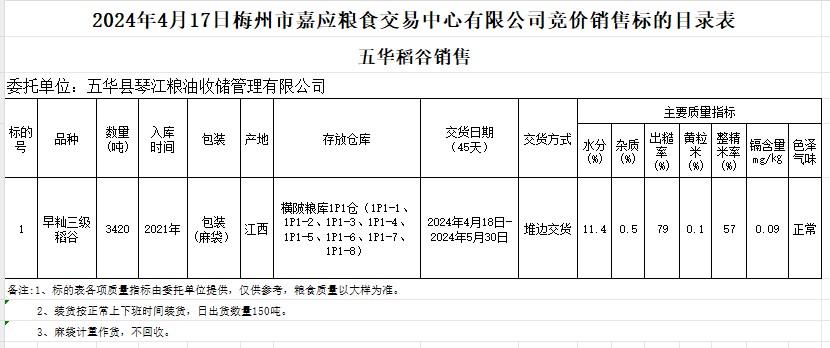 受客戶委托,梅州市嘉應(yīng)糧食交易中心有限公司定于2024年4月17日(星期三)舉辦糧食競價交易會。五華縣琴江糧油收儲管理有限公司擬銷售2021年產(chǎn)早秈稻3420噸。