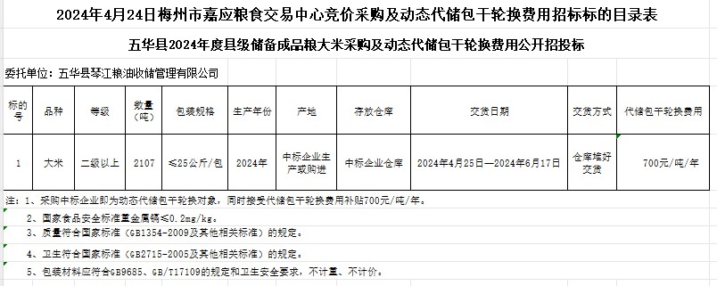 五華縣2024年度縣級(jí)儲(chǔ)備成品糧大米采購(gòu)及動(dòng)態(tài)代儲(chǔ)包干輪換費(fèi)用公開招標(biāo)公告