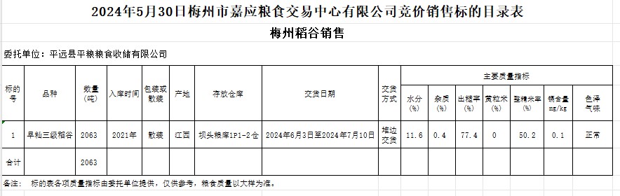 受客戶委托,梅州市嘉應(yīng)糧食交易中心有限公司定于2024年5月30日(星期四)舉辦糧食競價交易會。平遠(yuǎn)縣平糧糧食收儲有限公司擬銷售2021年產(chǎn)早秈稻2063噸。