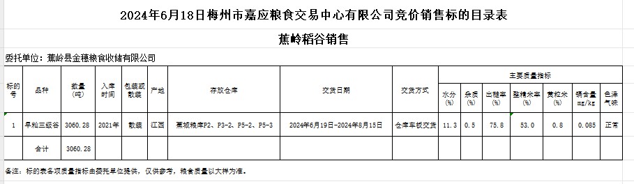 受客戶委托,梅州市嘉應糧食交易中心有限公司定于2024年6月18日(星期二)舉辦糧食競價交易會。蕉嶺縣金穗糧食收儲有限公司擬銷售2021年產(chǎn)早秈稻3060.28噸。