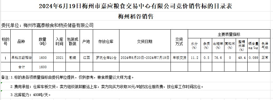 受客戶委托,梅州市嘉應糧食交易中心有限公司定于2024年6月19日(星期三)舉辦糧食競價交易會。梅州市嘉泰糧食和物資儲備有限公司擬銷售2021年產早秈稻1600噸。