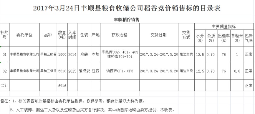 受客戶委托,梅州市嘉應(yīng)糧食交易中心有限公司定于2017年3月24日舉辦糧食競價交易會,豐順縣糧食收儲公司擬銷售早秈三級稻谷6916噸。