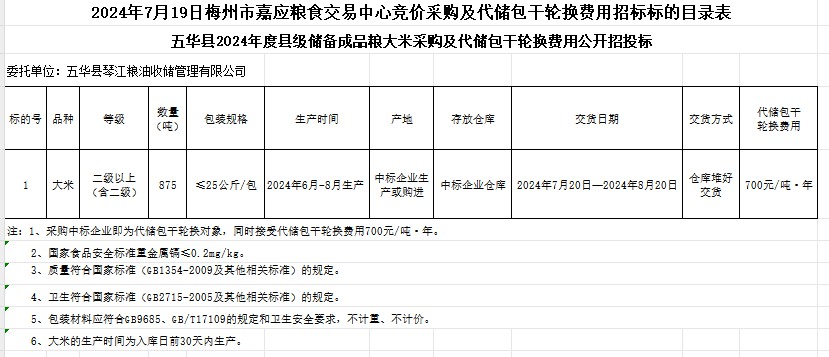五華縣2024年度縣級(jí)儲(chǔ)備成品糧大米采購(gòu)及代儲(chǔ)包干輪換費(fèi)用公開(kāi)招標(biāo)公告