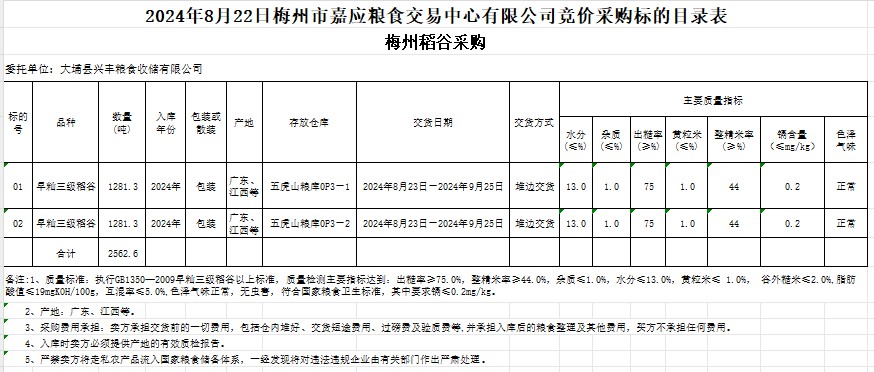 受客戶委托,梅州市嘉應(yīng)糧食交易中心有限公司定于2024年8月22日(星期四)舉辦糧食競價交易會。大埔縣興豐糧食收儲有限公司擬采購2024年產(chǎn)早秈稻谷2562.6噸。