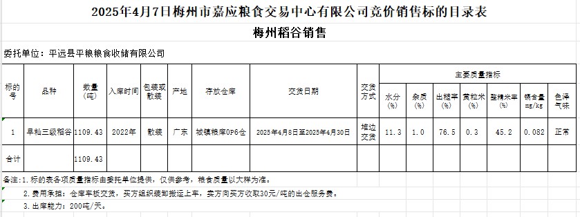 受客戶委托,梅州市嘉應糧食交易中心有限公司定于2025年4月7日(星期一)舉辦糧食競價交易會。平遠縣平糧糧食收儲有限公司擬銷售2022年產(chǎn)早秈稻1109.43噸。