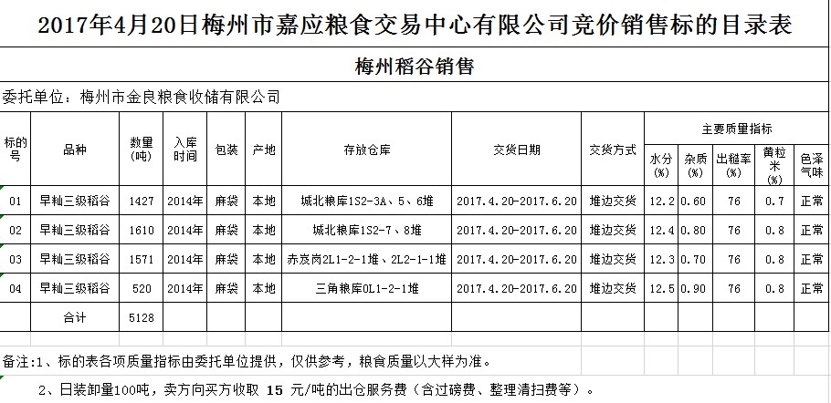 受客戶委托,梅州市嘉應(yīng)糧食交易中心有限公司定于2017年4月20日舉辦糧食競價交易會,梅州市金良糧食收儲有限公司擬銷售2014年早秈三級稻谷5128噸。