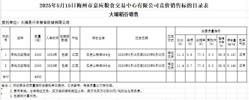 受客戶委托,梅州市嘉應(yīng)糧食交易中心有限公司定于2025年5月15日(星期四)舉辦糧食競價(jià)交易會(huì)。大埔縣興豐糧食收儲(chǔ)有限公司擬銷售2022年產(chǎn)早秈稻谷4800噸。