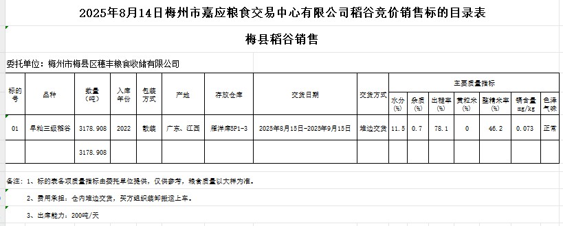 受客戶委托,梅州市嘉應(yīng)糧食交易中心有限公司定于2025年8月14日(星期四)舉辦糧食競價交易會。梅州市梅縣區(qū)穗豐糧食收儲有限公司擬銷售2022年產(chǎn)早秈稻谷3178.908噸。
