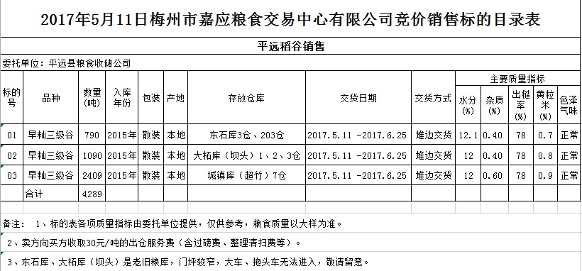 受客戶委托,梅州市嘉應糧食交易中心有限公司定于2017年5月11日舉辦糧食競價交易會,平遠縣糧食收儲公司擬銷售2015年早秈三級稻谷4289噸。