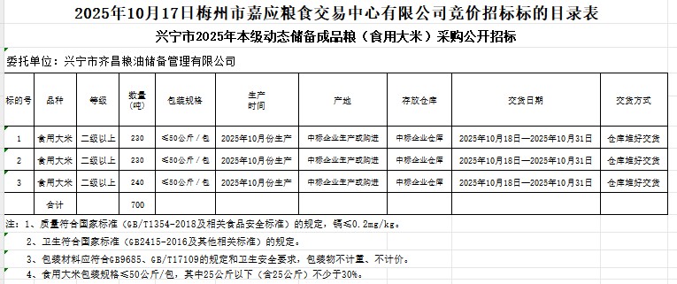 興寧市2025年本級動態(tài)儲備成品糧(食用大米)采購及代儲包干輪換費(fèi)用公開招標(biāo)公告