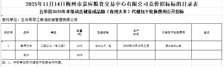 五華縣2025年本級(jí)動(dòng)態(tài)儲(chǔ)備成品糧(食用大米)采購及代儲(chǔ)包干輪換費(fèi)用公開招標(biāo)公告