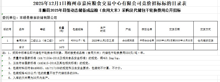 豐順縣2025年縣級(jí)動(dòng)態(tài)儲(chǔ)備成品糧(食用大米)采購及代儲(chǔ)包干輪換費(fèi)用公開招標(biāo)公告