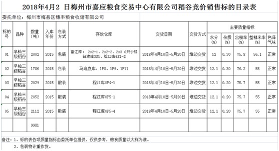 受客戶(hù)委托,梅州市嘉應(yīng)糧食交易中心有限公司定于2018年4月9日(星期一)舉辦糧食競(jìng)價(jià)交易會(huì),梅州市梅縣區(qū)穗豐糧食收儲(chǔ)有限公司擬銷(xiāo)售早秈稻9981噸。
